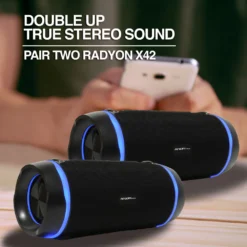 ¡Ha llegado la nueva línea premium de altavoces portátiles! La Radyon X42 cuenta con una correa de transporte para el hombro e incluye impresionantes efectos de iluminación. Construido con los últimos chipsets y características. Esto permite un sonido excelente e integra la tecnología TWS para poder emparejar dos altavoces para obtener un sonido estéreo. Puede disfrutar de la música de forma inalámbrica a través de una conexión BT, la entrada auxiliar tradicional de 3,5 mm o a través de sus archivos de música almacenados en una unidad USB.