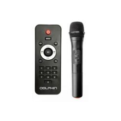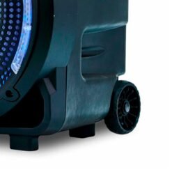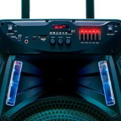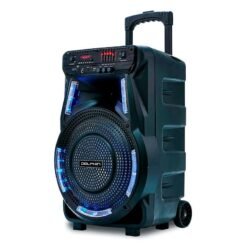 Esta es la bocina portátil Dolphin Party Speaker 12″ SP-1217RBT en color negro. Ofrece 7 horas de uso continuo, tecnología WaveSync, y Bluetooth. Tiene luces decorativas intermitentes, un conector para micrófono, y viene con asa y ruedas de carro. ¡Perfecta para llevar la fiesta a cualquier lugar!