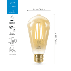 La última experiencia en iluminación Los bombillos inteligentes WiZ cuentan con la tecnología LED y te permiten controlarlos a través de la app WiZ en tu dispositivo móvil o con el asistente de voz a través de Alexa, Siri Shortcuts o Google Assistant. Las luces WiZ se conectan a la red Wi-Fi existente, sin necesidad de otro hardware. Puedes programar las luces para que se enciendan o apaguen según tus rutinas diarias o semanales, controlarlas con tu smartphone o comandos de voz e incluso puedes tener acceso a tu iluminación cuando no estás en casa. Estos bombillos vintage proporcionan el toque ideal de decoración para los espacios de tu hogar.929002265911 Wi-Fi DIM/6W A19 AmberBombillo A19 con acabado vintage. Puedes controlarlo a través de Wi-Fi con la aplicación o con tu voz de forma muy sencilla Proporciona Luz cálida 2000K atenuableatenuable