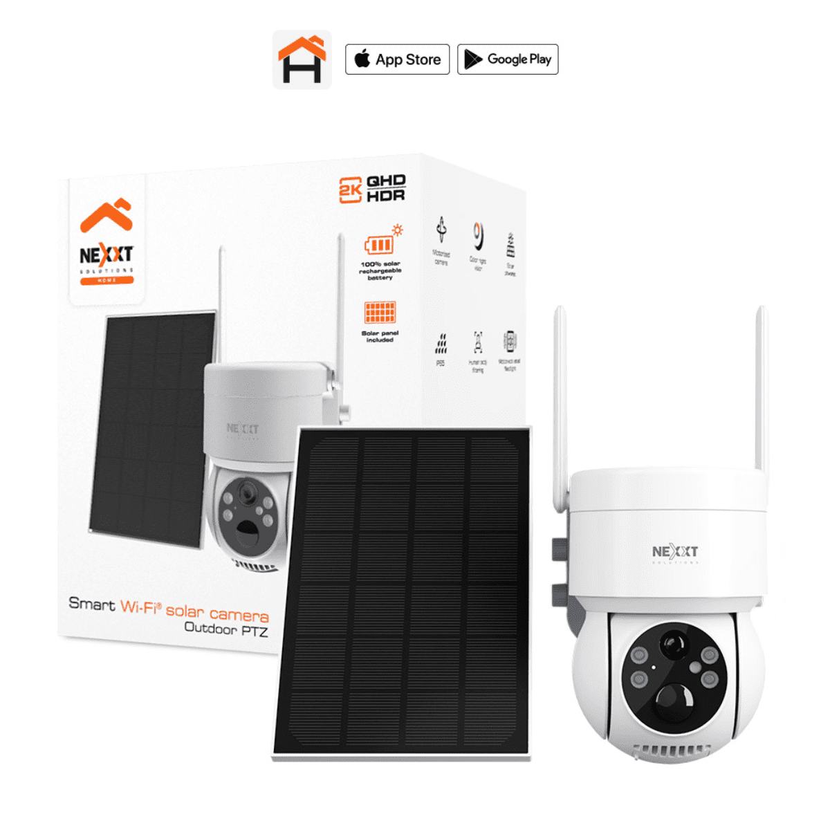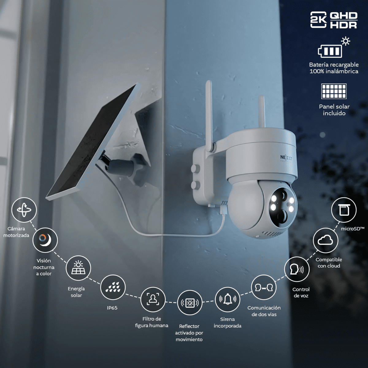 Camara Wifi NEXXT NHC-OP20S Para Exteriores, color blanco, resolución 2K, Ángulo de visión 110, tarjeta microSD hasta 128GB, Movimiento motorizado PTZ, control de voz, IP65 resistencia al polvo y salpicaduras, Sirena integrada, inalámbrica, Funciona con energía solar.