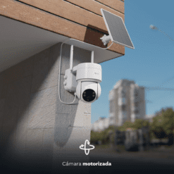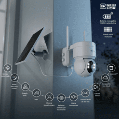 color blanco, resolución 2K, Ángulo de visión 110, tarjeta microSD hasta 128GB, Movimiento motorizado PTZ, control de voz, IP65 resistencia al polvo y salpicaduras, Sirena integrada, inalámbrica, Funciona con energía solar.