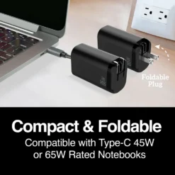 • Compatible con portátiles de 45 W o 65 W que utilicen un puerto de carga tipo C. Debe usar un cable de carga nominal de alta velocidad de 45 W o 65 W.