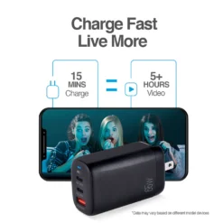 Cargador de Pared ARGOM ARG-AC-0126BK VOLTA P8, Color Negro 2 puertos PD USB-C y 1 puerto USB QC3.0 65W, 3AMP. El Volta P8 también incluye funciones de seguridad como sobrecorriente, sobretensión y cortocircuito.