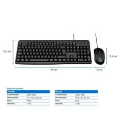- Dúo de teclado multimedia en español y mouse de conexión USB con cable.