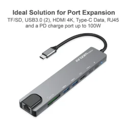 Descripción Amplíe las opciones de puertos de su computadora o teléfono móvil con nuestro concentrador Tipo-C 8 en 1. El One Axess 8 en 1 le permite conectar un monitor externo (HDMI); Unidad de memoria USB u otros periféricos USB (USB3.0); transfiera medios desde su tarjeta SD y Micro SD; acceda a Internet a 1 Gbps (puerto de red RJ-45); y transferir datos desde el puerto tipo C. Este concentrador también está equipado con un puerto de carga PD de hasta 100W. ¡Simplemente inserte el concentrador en un puerto de dispositivo compatible con Type-C/PD y disfrute!