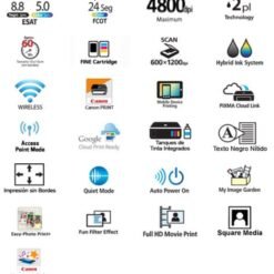 | Otras características | Sistema de Tinta Integrado – 4 colores, Sistema de Tinta Híbrido, Matríz Full Dot LCD, Encendido Rápido, Alto rendimiento de 6,000 páginas en negro, 7,000 en color y 2000 fotos en color, Texto Nítido, Wi-Fi, Clasificación EPEAT Plata, Encendido y Apagado Automático, Modo Silencioso, Aplicación Canon PRINT1, PIXMA Cloud Link |