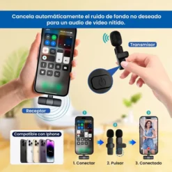 Kit de 2 Micrófonos Inalámbricos K9 K9N2S – En color negro, este kit incluye dos micrófonos con entrada tipo Lightning, una duración de batería de 4-5 horas, una distancia de transmisión de hasta 20 metros y operan en una frecuencia de 2.4 GHz.
