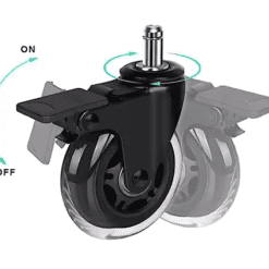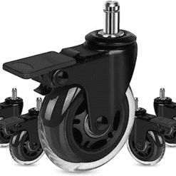 Kit de 5 rodos giratorios K5N en color negro semitransparente, fabricados en poliuretano sólido. Repuesto universal para sillas de oficina, muebles, sillas giratorias, estantes móviles, equipo médico, scooters, etc. Capacidad de carga de 111 lb y diámetro de 3 pulgadas. Perfectos para un desplazamiento suave y silencioso.